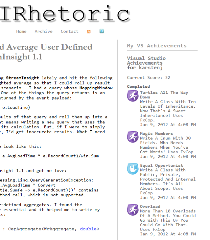 Ayrıca, achievementlarımızı blog sayfamızda kullanmamız da mümkün. Visual Studio Achievements Widget kullanıp, sayfamıza tek satırlık bir script ekleyerek achievementlarımızı kendi blogumuzda gösterebiliyoruz. WordPress widgetları içinde php scriptleri kabul etmediği için ben şu anda kullanamıyorum. 😦
