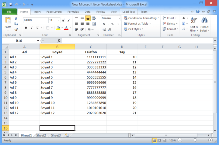 Ayrıca, uygulamamızda okumak için bir Excel dosyası oluşturarak içine çeşitli bilgiler girelim.
