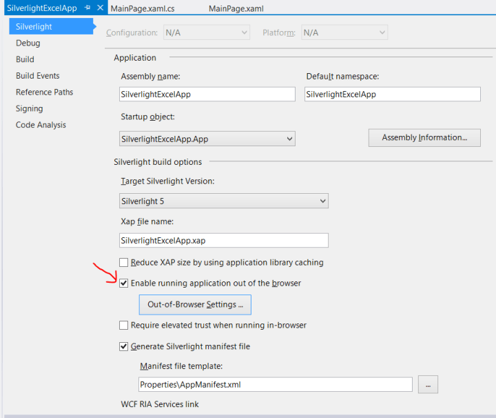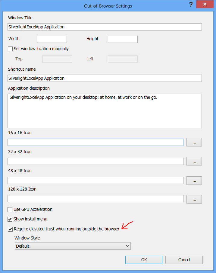 Uygulamamızı çalıştırmadan önce yapmamız gereken son işlem ise, uygulamamızı Out-of-Browser ve elevated trust modlarında çalışacak şekilde ayarlamamız. AutomationFactory güvenlik sebeplerinden dolayı yalnızca yüksek güvenlikte ve out-of-browser modunda çalışabiliyor. Araştırdığım kadarıyla browser içinde de elevated trust modunda çalıştırmak mümkün, ancak bunun için Group Policy ayarları gerekli.