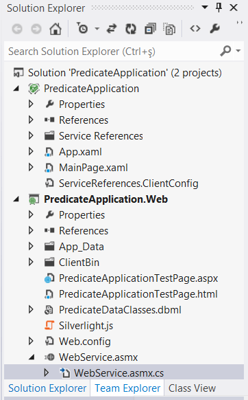 PredicateApplication uygulamasını açtığımızda, Solution Explorer’da aşağıdaki dosyaları görüyoruz. Buradan PredicateApplication.Web projesi içerisindeki WebService.asmx.cs dosyasını açalım.