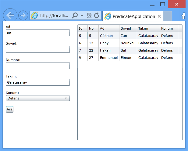 Gerçek hayatta futbolu pek sevmem ancak burada güzel bir örnek olduğu için onu kullanıyorum. Diyelim ki futbol oyuncularını bir veritabanında tutuyoruz, ve kullanıcıların gelip bu veritabanından oyuncunun adına, soyadına, forma numarasına, takımına ve oynadığı konuma göre arama yapmasını istiyoruz. Gözümüzde canlanması için aşağıdaki arayüzü veriyorum.