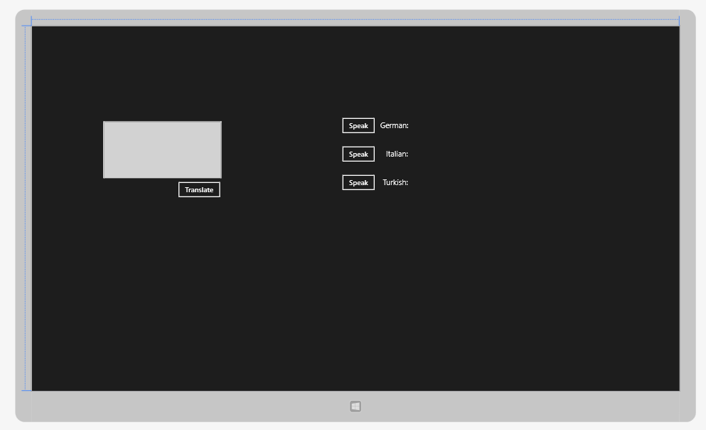 Next, we will prepare the interface. Our application will be simple: We will get a text from user in English and translate it to 3 other languages (German, Italian and Turkish), and then the user can click a button to speak the translated text out loud. The code for our MainPage.xaml will look like this: