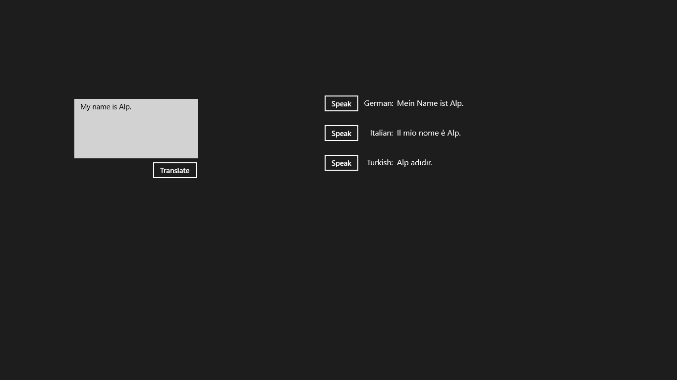 If you start the application now, you will see that we are translating our text. The last thing we need to add is to speak the translated text, which we will accomplish in the click events of the speak buttons: