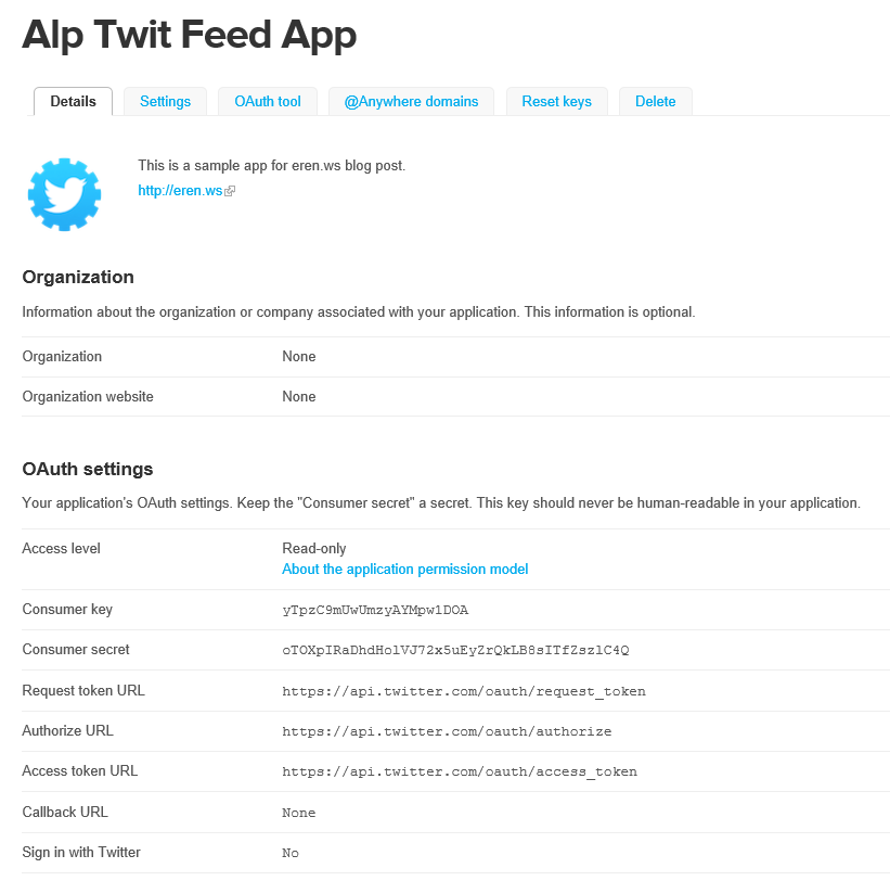 After filling in the required sections, accept the “Developer Rules of the Road”, enter the Capthcha and then click “Create your Twitter application”. When you do this, a page that provides the details for your application will open.