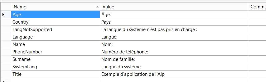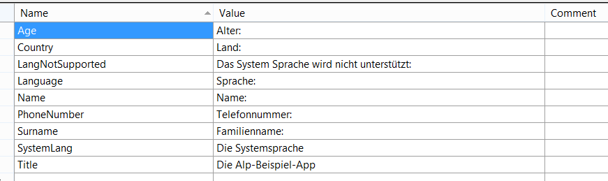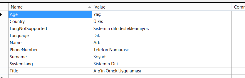 This is where we will be putting our translated strings. Name part is how we will access it (so this part will be the same in all our resource files), value is the translated string, and comment can be used for reminders such as how that particular string is used (for correct translations). We will then need to fill this resource file with the strings that we will translate. In our app, this will be the following: The strings in the form (name, surname, phone number etc.), the title of the app, the content of system language button, and the error message that we will display if the system language is not supported (we have to think of everything :)). This file will look like this when filled out for English: