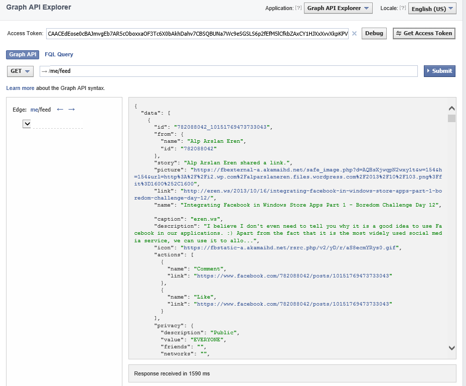 Open Graph API Explorer by browsing to https://developers.facebook.com/tools/explorer, enter “me/feed” to the textbox (me/feed gets our timeline) and click submit. You may need to give read_stream permission to Graph API Explorer, which can be done by clicking “Get Access Token” and selecting appropriate permissions from the list. It will return a large json string consisting of your timeline items.