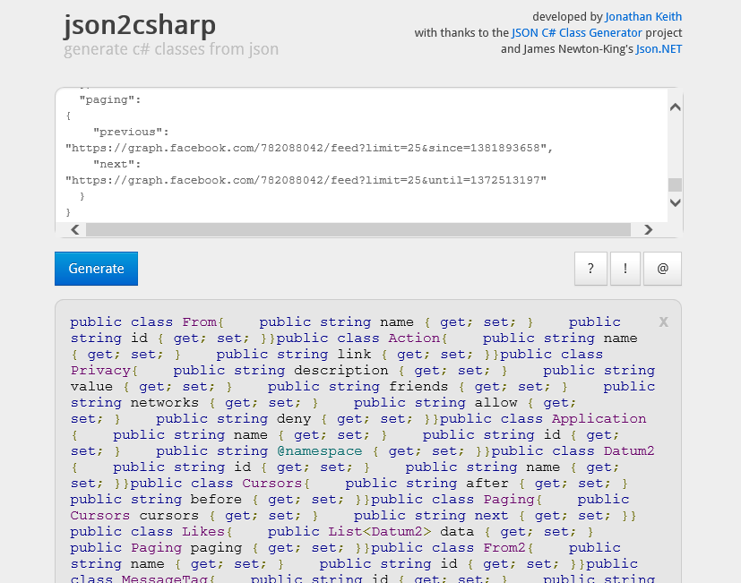 Now copy that entire Json string, paste it in http://json2csharp.com/ and click Generate.