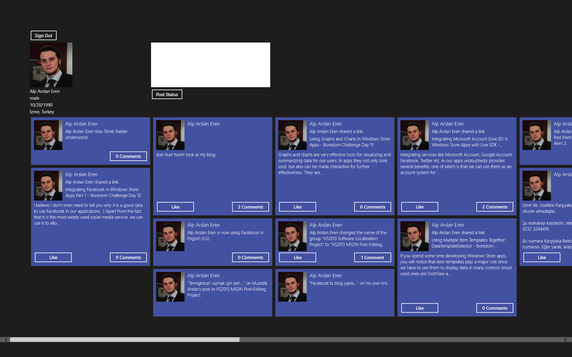 This has been a long post, and although I know the article hasn’t been very user friendly and easy to follow I did my best to explain as clearly as possible. Also, we just made a simple demonstration; you can also view the pictures and videos in posts and so on; Facebook has a lot of different post types. The best way to handle it would be preparing different templates (user controls) for different post types and then using ItemTemplateSelector to choose which one to use.