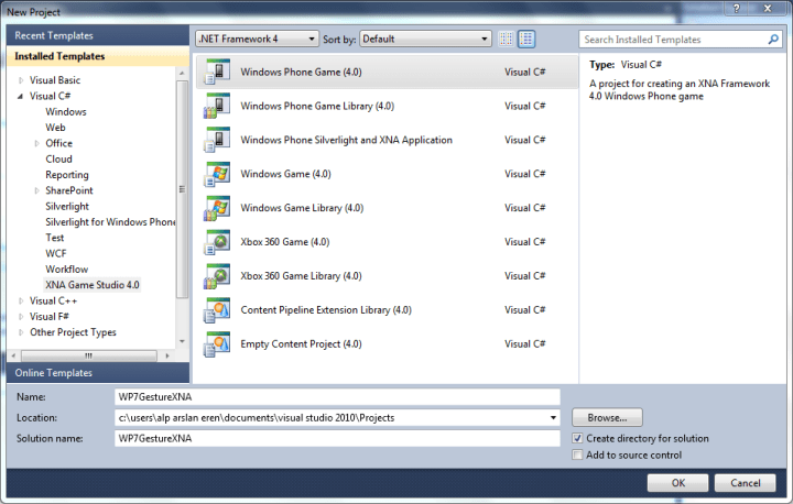 Öncelikle, işe Visual Studio içinde yeni bir Windows Phone Game projesi açarak başlayalım. Bu projenin adını WP7GestureXNA koydum. Projeyi açarken versiyon sorduğunda da Windows Phone 7.1 seçelim.