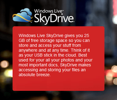 En temel haliyle, SkyDrive Microsoft’un her Windows Live ID’ye ücretsiz sağladığı bulut tabanlı bir dosya depolama alanı. 25 gigabyte’a kadar izin veren bu kullanışı pratik sistem sayesinde dosyalarımıza internet üzerinden her yerden erişebilmenin yanı sıra, bu dosyaları başkaları ile paylaşmamız, düzenlememiz, hatta yeni dosyalar yaratmamız da mümkün.